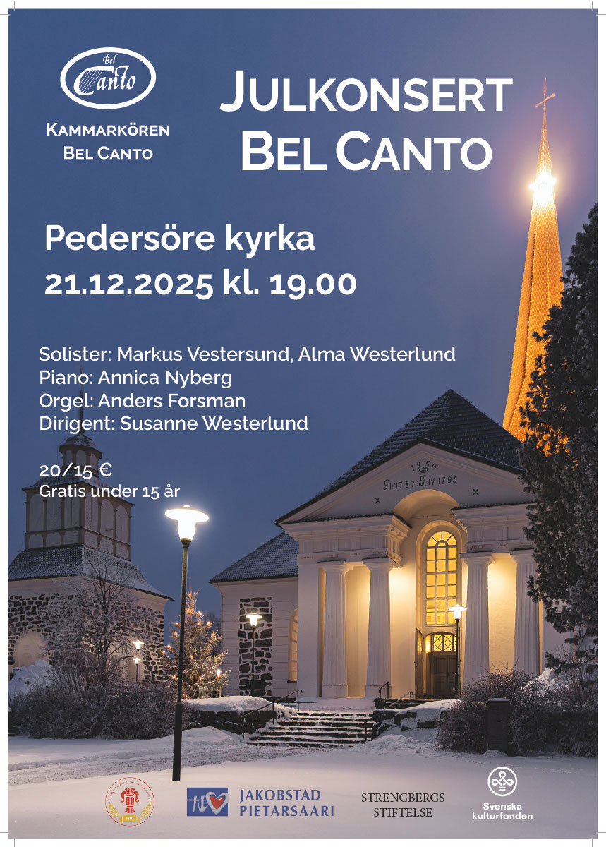 21.12.2025 kl 19:00 i Pedersöre kyrka Dela detta: Klicka för utskrift (Öppnas i ett nytt fönster) Skriv ut Klicka för att e-posta en länk till en vän (Öppnas i ett nytt fönster) E-post Klicka för att dela på Facebook (Öppnas i ett nytt fönster) Facebook Klicka för att dela på X (Öppnas i ett nytt fönster) X Mer Klicka för att dela på Pocket (Öppnas i ett nytt fönster) Pocket Klicka för att dela via LinkedIn (Öppnas i ett nytt fönster) LinkedIn Klicka för att dela på Tumblr (Öppnas i ett nytt fönster) Tumblr Klicka för att dela på WhatsApp (Öppnas i ett nytt fönster) WhatsApp Gilla detta:Gilla Laddar in … 15.12.2025 / 2025, Konsert
